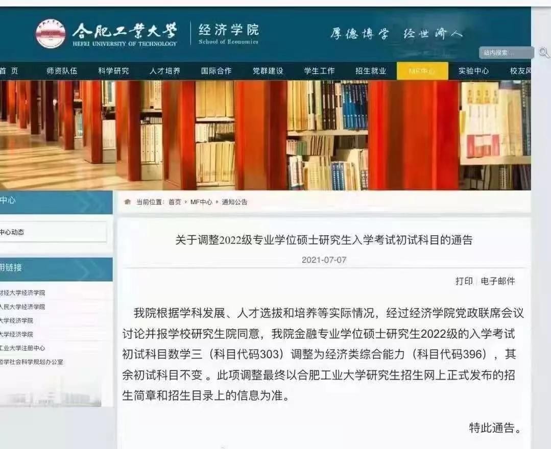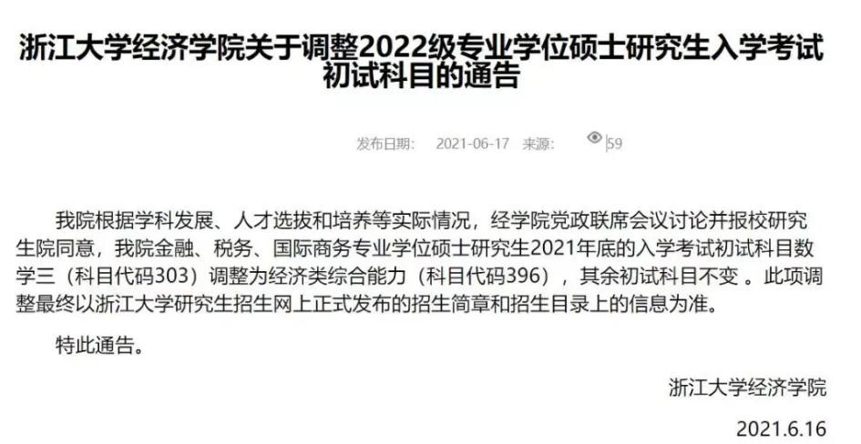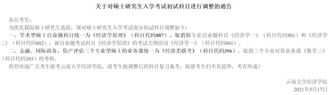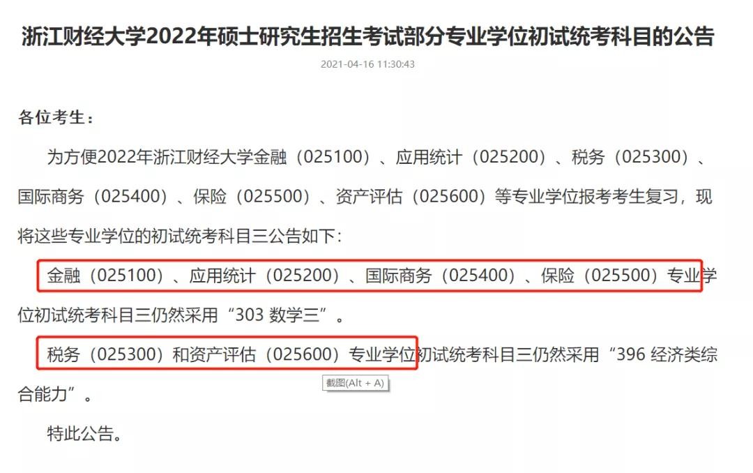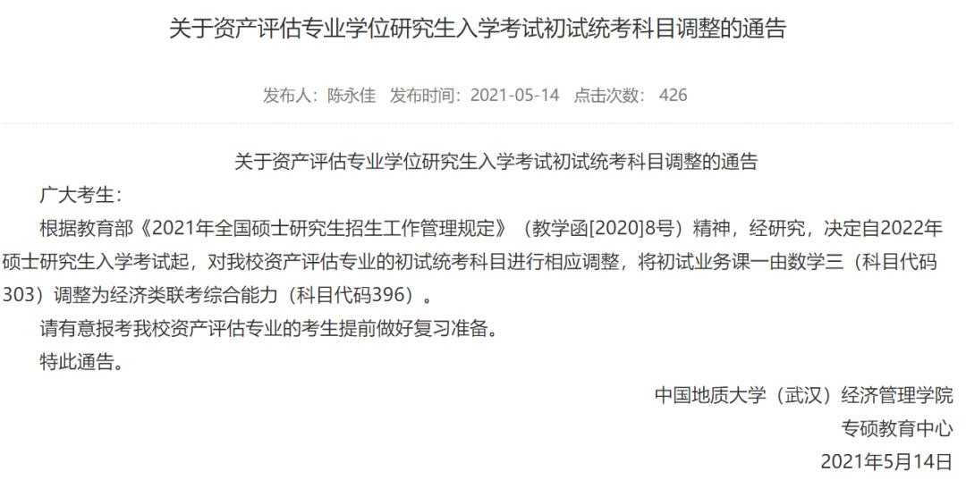 国际商务、税务和资产评估3个专硕专业的初试统考科目三由“数三”(科目代码为303)调整为“经济类综合能力”(科目代码为396)。