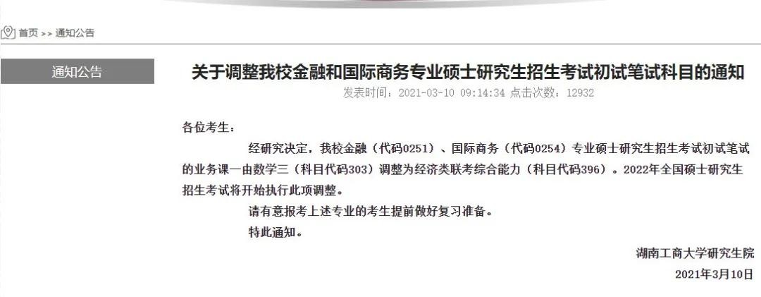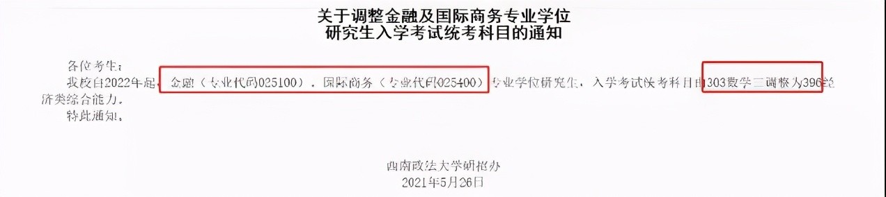 金融、税务、国际商务专业学位研究生考试初试科目数学三(科目代码303)调整为经济类综合能力(科目代码396)。