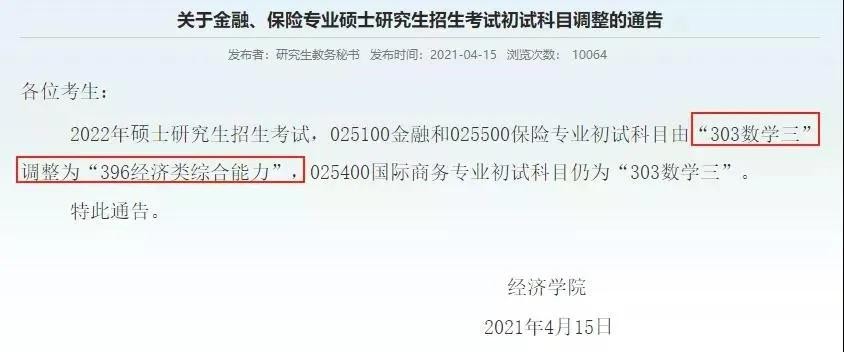 金融、税务、保险、国际商务、资产评估5个专硕初试科目业务课一将由303数学三调整为396经济类综合能力。