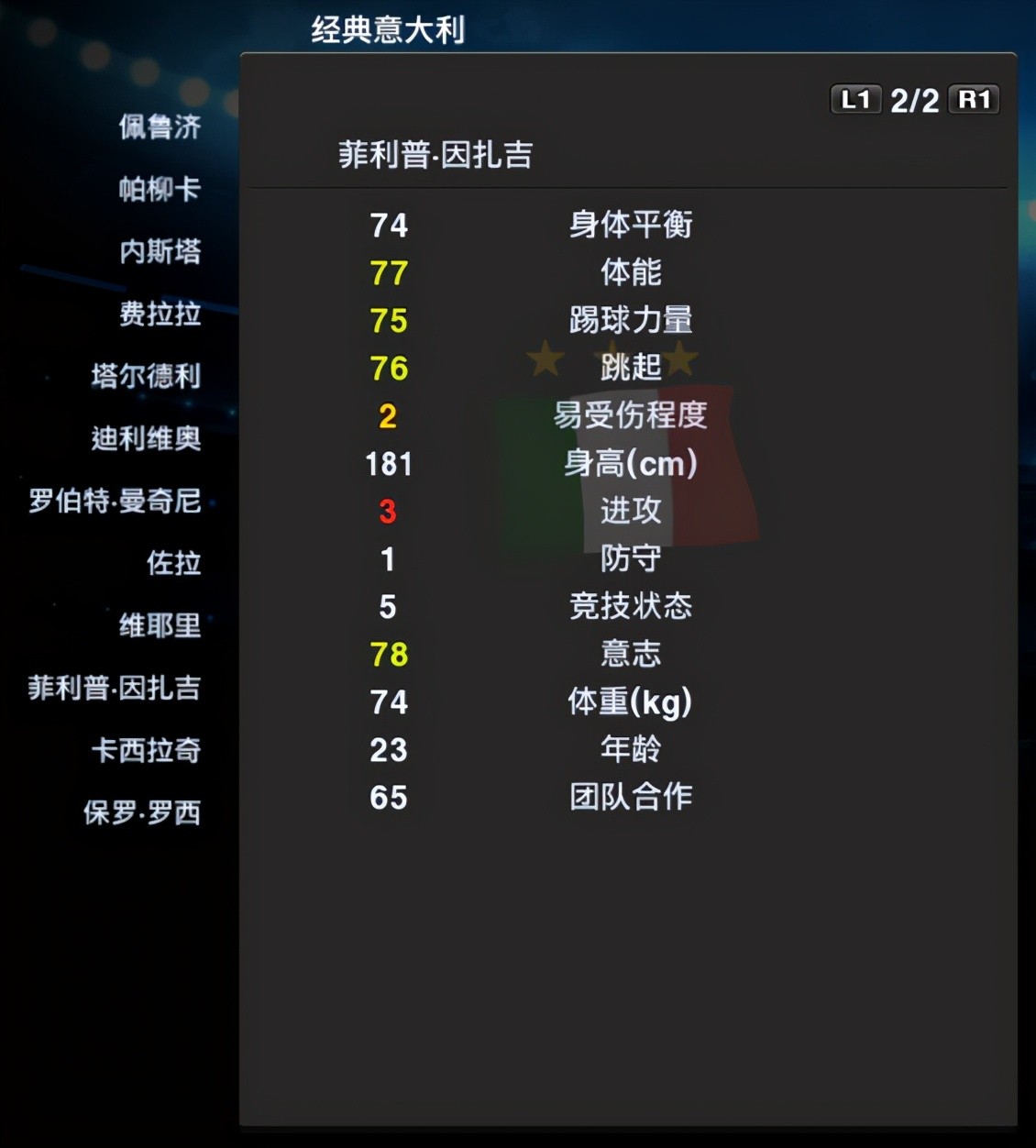 从上面两张图可以看得出因扎吉的启动比较快,反应也比较快,不足的是身体和射门稍微差,包括头球也差了点。