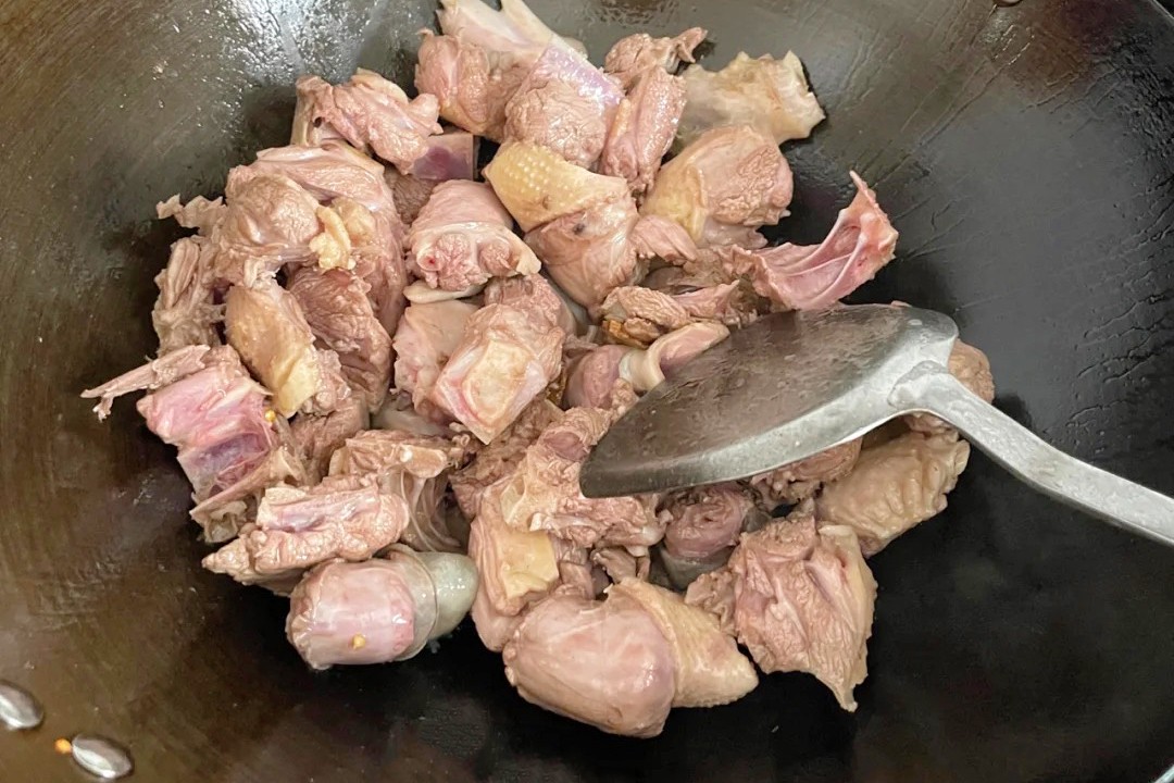2、热锅加油,先倒入芋头,小火煎至芋头表面略显金黄色后,盛出来,锅内留有底油,放入大蒜和生姜炒香,再倒入鸭肉,转大火不断翻炒至鸭肉表面水分变干;