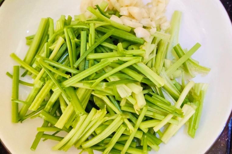食材准备:芹菜3棵、五花肉1小块、尖椒1根、大蒜3瓣、料酒1勺、生抽1勺、蚝油1勺