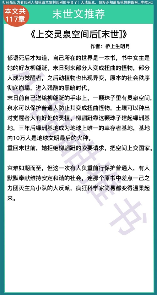 第六本《上交灵泉空间后[末世]》作者:桥上生明月