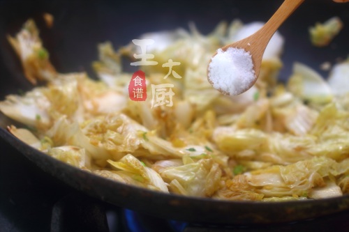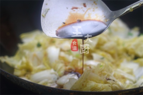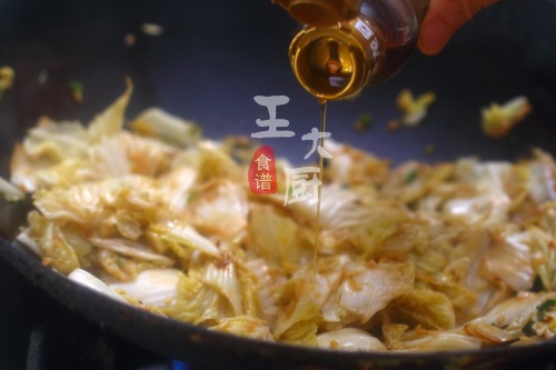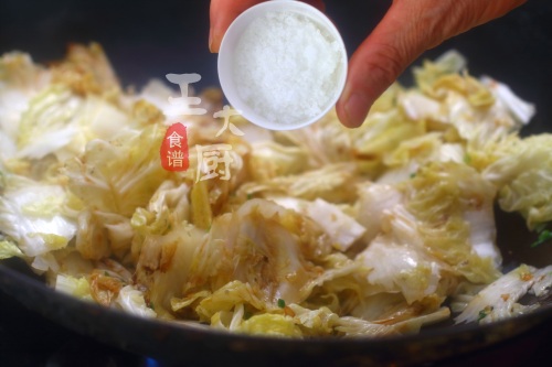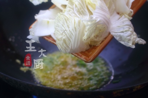 3、再将准备好的白菜片放在锅中,进行翻炒。
