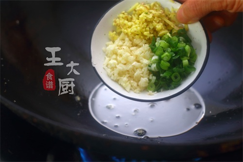 2、起锅烧油,将准备好的葱花、姜末、蒜末放在锅中,进行翻炒。