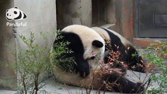 在成都大熊猫繁育研究基地,熊猫用胖墩墩的小腿挠着痒痒,身上的肉肉也跟着节奏抖动着,十分可爱。
