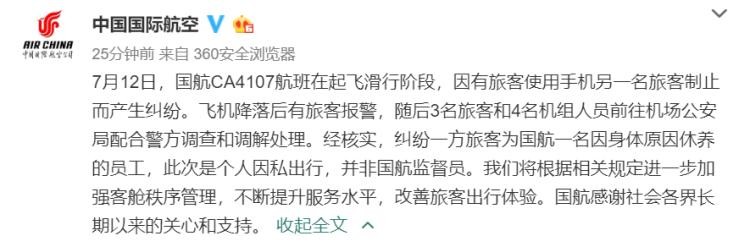 今天下午,国航发布微博称,7月12日,国航CA4107航班在起飞滑行阶段,因有旅客使用手机另一名旅客制止而产生纠纷。飞机降落后有旅客报警,随后3名旅客和4名机组人员前往机场公安局配合警方调查和调解处理。经核实,纠纷一方旅客为国航一名因身体原因休养的员工,此次是个人因私出行,并非国航监督员。国航还表示,将根据相关规定进一步加强客舱秩序管理,不断提升服务水平,改善旅客出行体验。