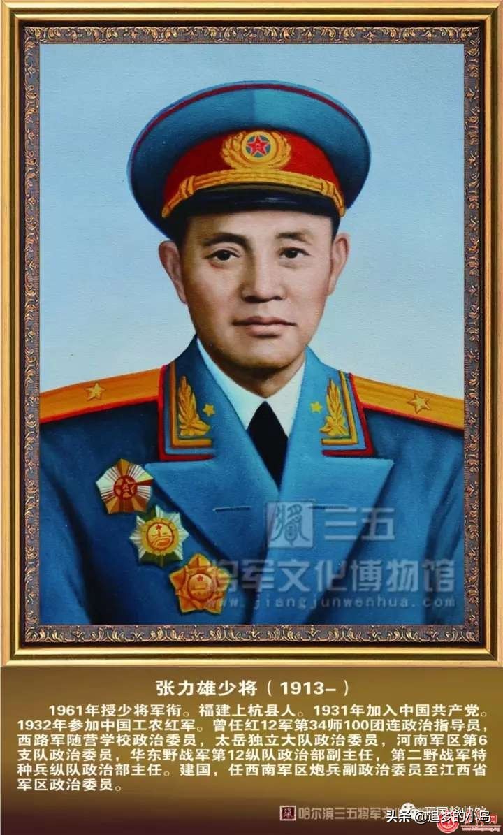 少将张力雄,1913年11月21日出生于福建省上杭县。中国人民解放军高级将领。 曾任昆明军区公安军第一副司令员,云南军区副司令员,昆明军区司令部副参谋长,云南省军区政治委员,江西省军区政治委员,福州军区顾问。1961年被授予少将军衔 。