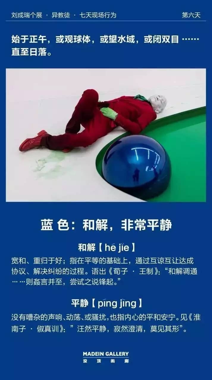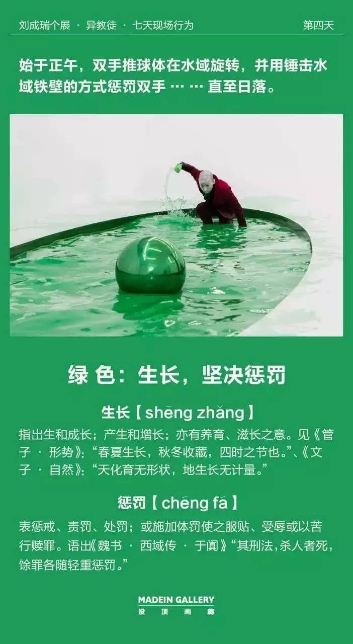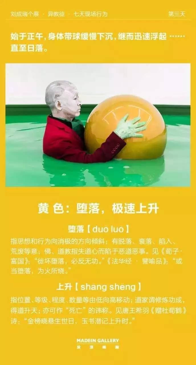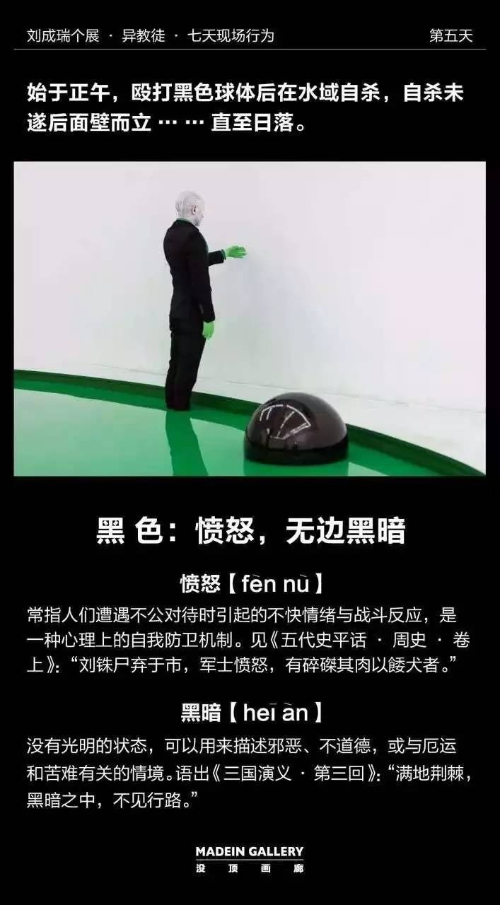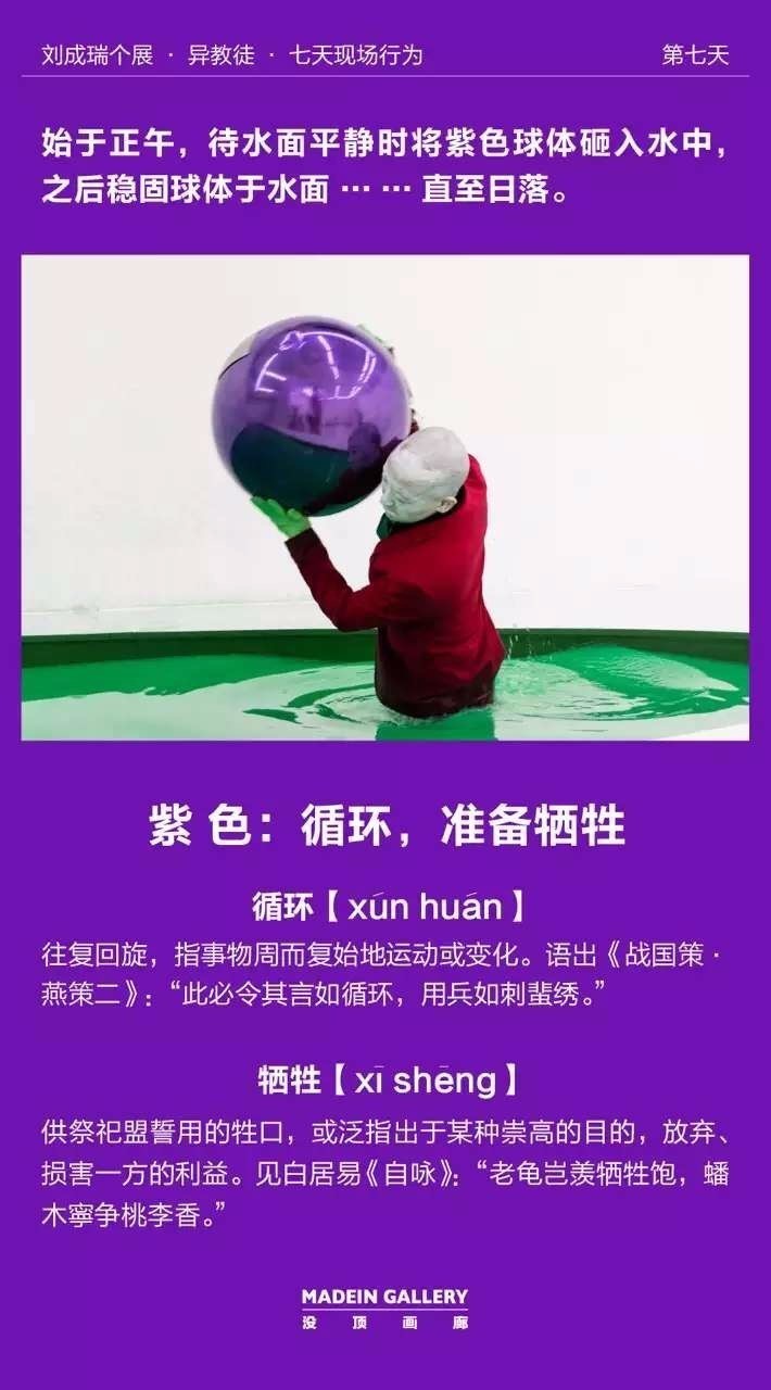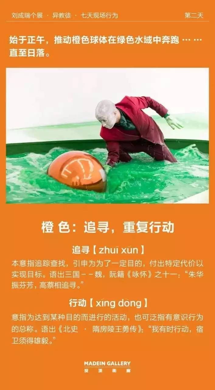 也同样是第一次,他提前对七天的颜色做了“解读”,赋予每种颜色一定的意象,并制作了图片。在刘成瑞看来,异教徒的文字和现场一样重要,颜色代表的意义,包括引用的古文字,相对有文学性。七天的表演就像一次分行写作,这和之前他现场对故事性的强调相比,会更开阔。