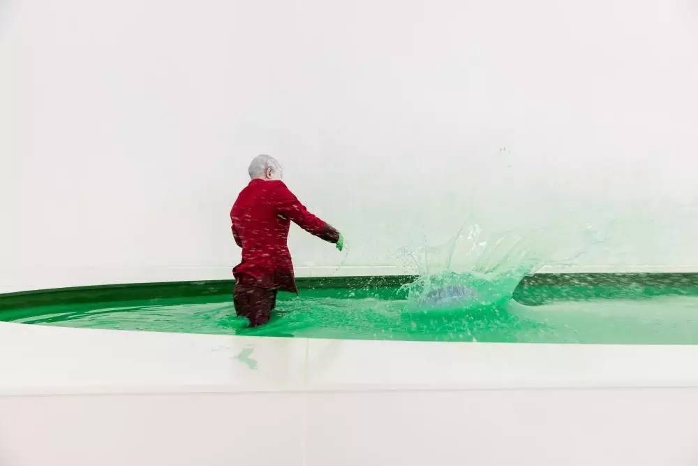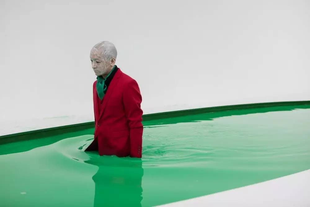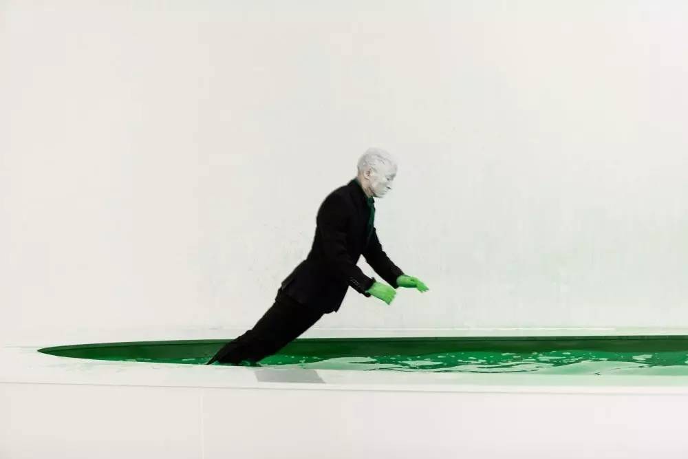 第一天的红色和第七天的紫色构成了首尾循环,而黑色是其中最沉重的部分。这一天也是刘成瑞唯一一天身着黑色西装的一天。他不停地自杀,不停地自杀未遂,背对观众,不停地沉到水底,起来,直直地面对墙面。