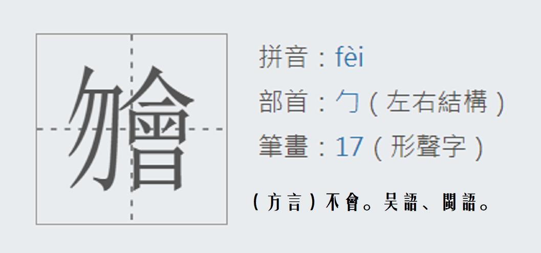 这个字如今仍然是福州话、建瓯话的常用字,表示“不会”、“不能”等义。福州话读音:ma,建瓯话读音:mai。