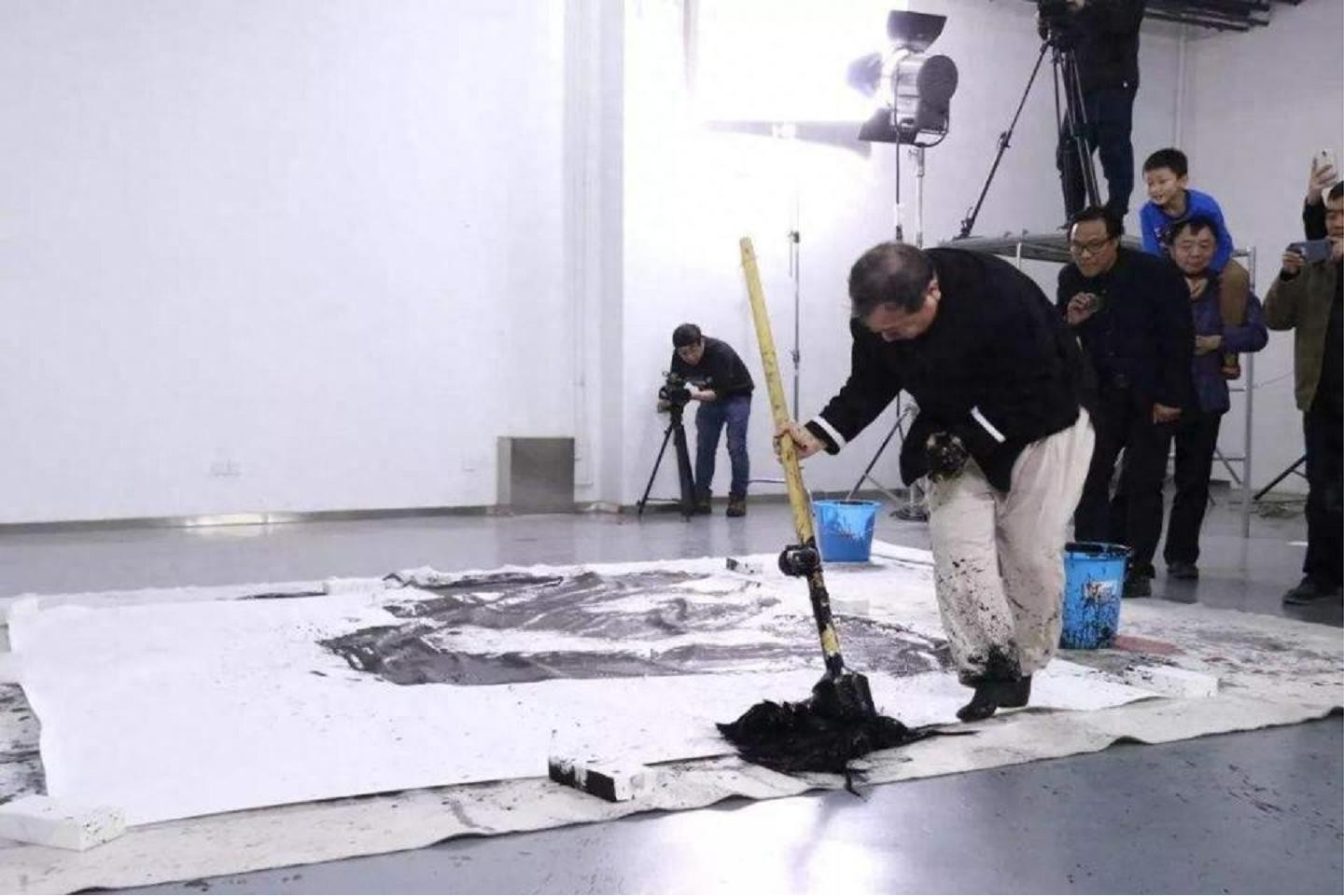 还有的人,拿拖把在地上铺着的纸或布上涂写,也是真实的书写。