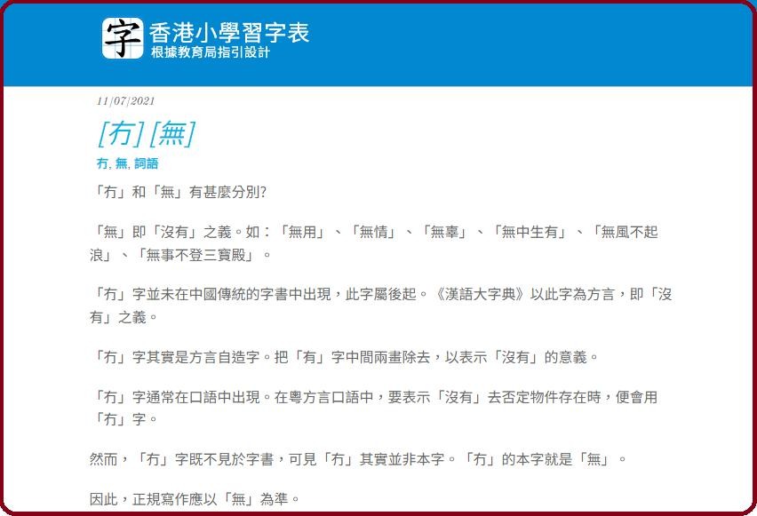“冇”词条,《香港小学习字表》网站指出:「冇」字其实是方言自造字。「冇」的本字就是「无」。因此,正规写作应以「无」为准。