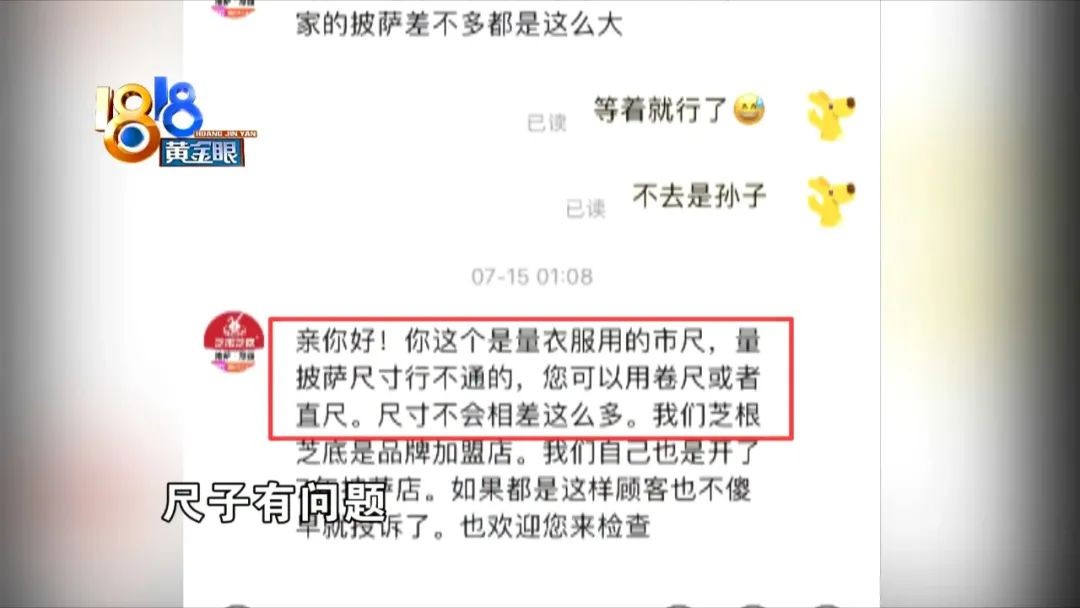 14号晚上,张先生点了个9英寸的披萨外卖。他说拿到之后,感觉比正常的小,他特意拿尺子量了量,确实小了。可商家说,是尺子的问题。