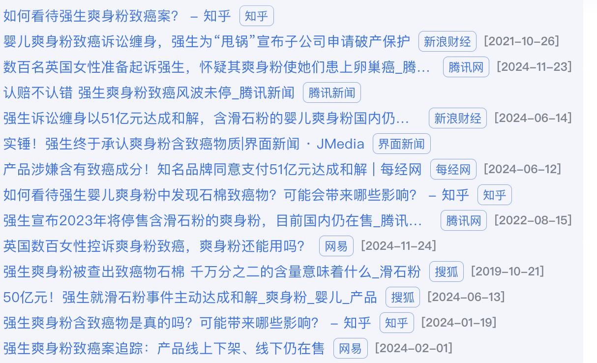 尽管强生公司已于2023年在全球范围内停止销售含滑石粉的婴儿爽身粉,并转而生产基于玉米淀粉的婴儿爽身粉,但在国内市场上,仍有含滑石粉的强生婴儿爽身粉在售。