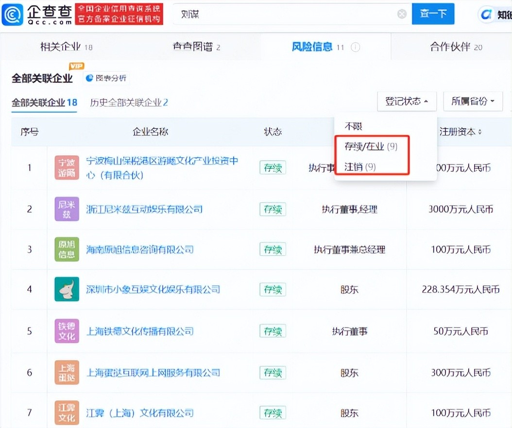 再来细致考察 PDD 的商业版图,便能清晰地发现他与十八家企业存在关联,其中有九家企业处于存续的状态。此外,他担任法定代表人等职务的企业总计有十四家,然而仅仅只有五家处于存续之中。