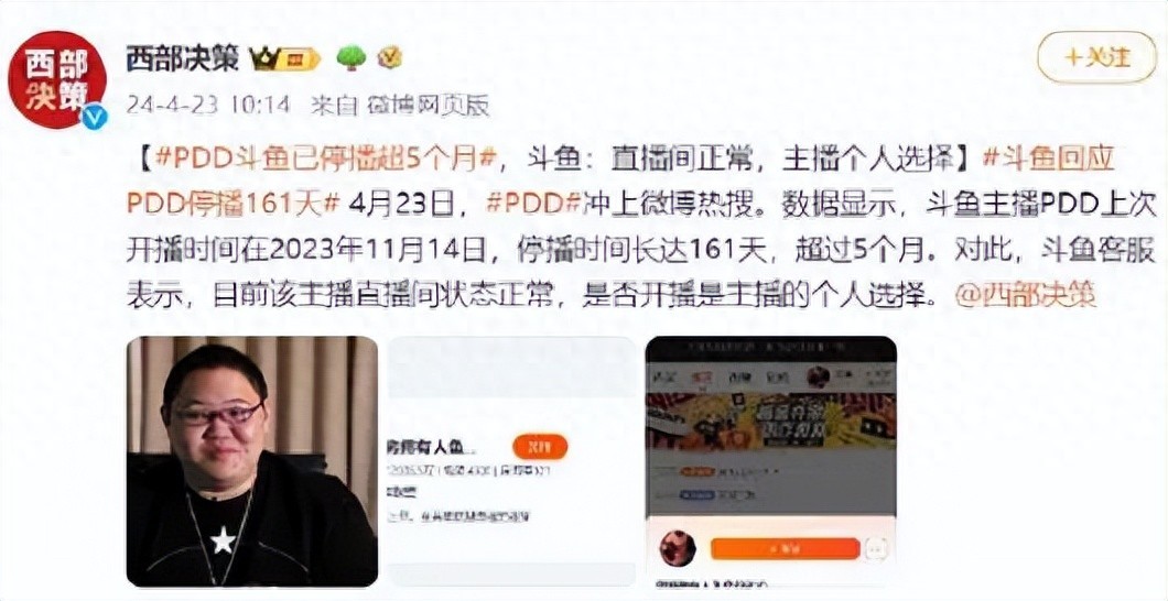 此前,斗鱼平台可谓是风云莫测、变幻无常,局势波谲云诡。令人意想不到的是,其创始人兼 CEO 陈少杰竟然遭到逮捕,多位头部主播也纷纷选择暂停直播。PDD 的停播是否与这一系列事件存在关联,目前尚且没有确切的信息能够予以证实。