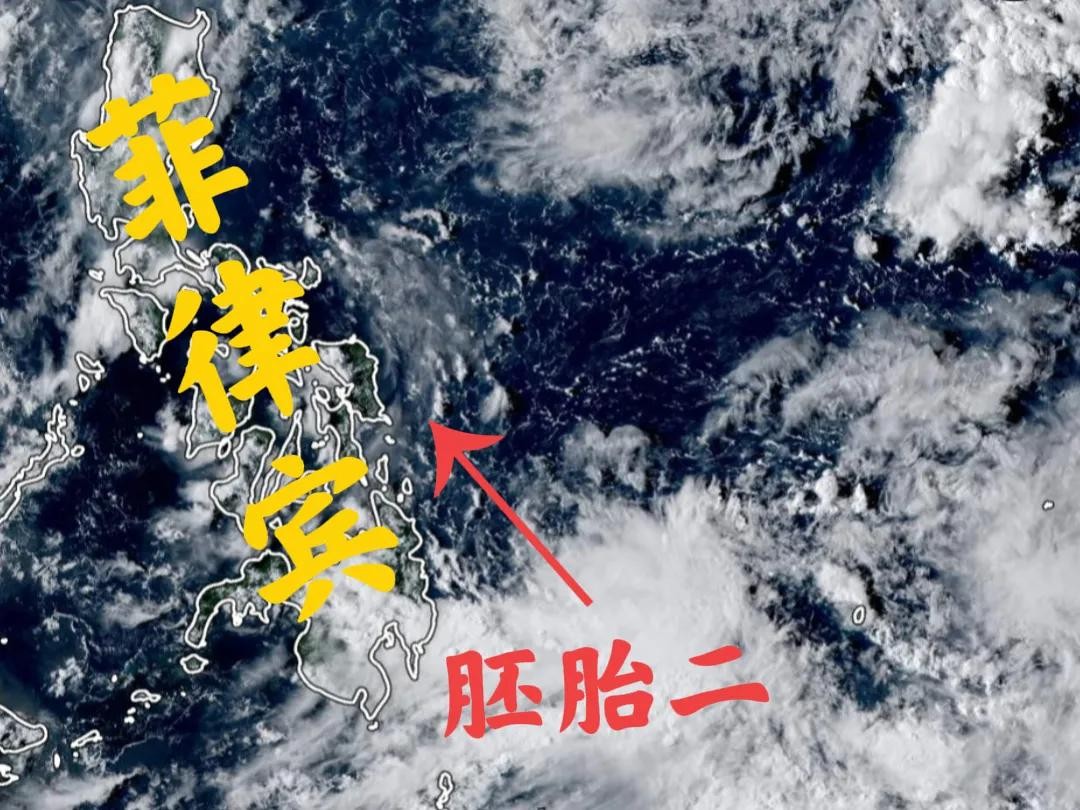 另外一个胚胎,则正在菲律宾东南方向的海域活动,其成因是由信风、季风汇合的季风槽发展而来。未来,它将缓慢趋向西北方向移动,强度维持或略有增强,后期可能被东侧新诞生的大型台风吸收: