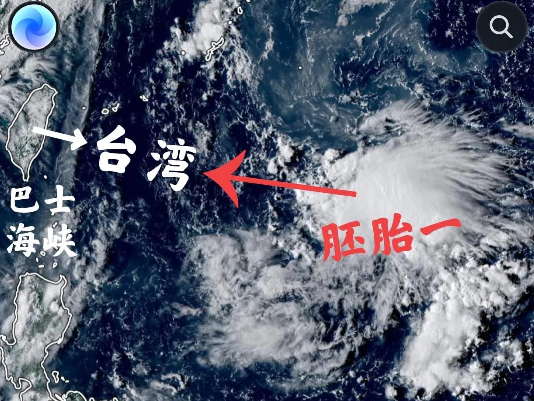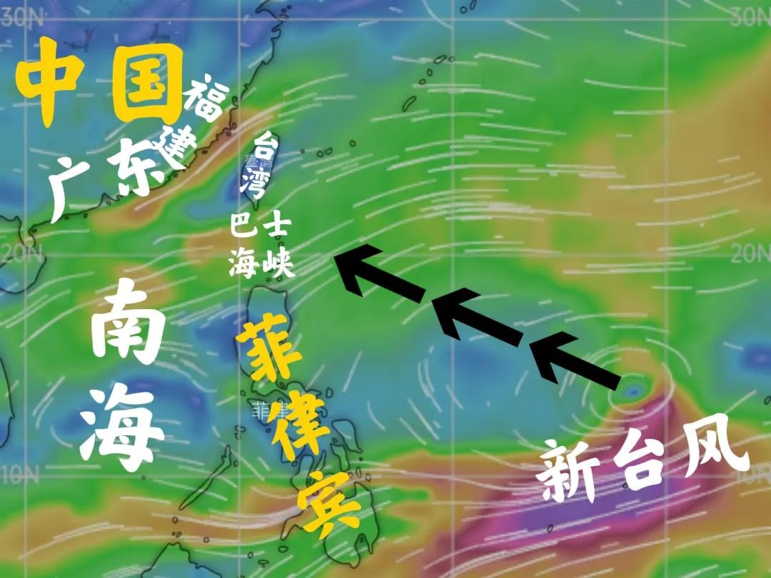 其中,一个台风胚胎正位于巴士海峡以东,其成因为北侧高空冷涡的旋转动量下传,诱发低空季风气流旋转上升而产生。未来短期内,它将向偏西方向移动、趋向我国——由于所处海域海温很高,其自身的对流足以维持发展,未来它将可能继续有所发展,有一定几率加强为一个弱台风: