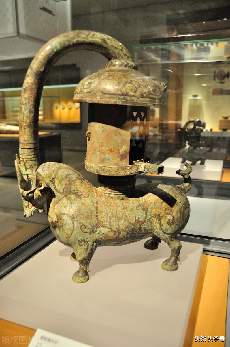 1980年出土于江苏邗江县甘泉2号东汉墓。错银铜牛灯为东汉青铜器,由灯座、灯盏、烟管三部分组装而成,灯座是一俯首站立、双角上耸的黄牛。牛腹中空,背负圆形灯盘,灯盘一侧设置扁平把手,便于转动灯盘,盘上饰两片可以灵活转动的灯罩,其中一片刻镂空菱形斜方格形纹,起到散热、挡风和调光的作用。