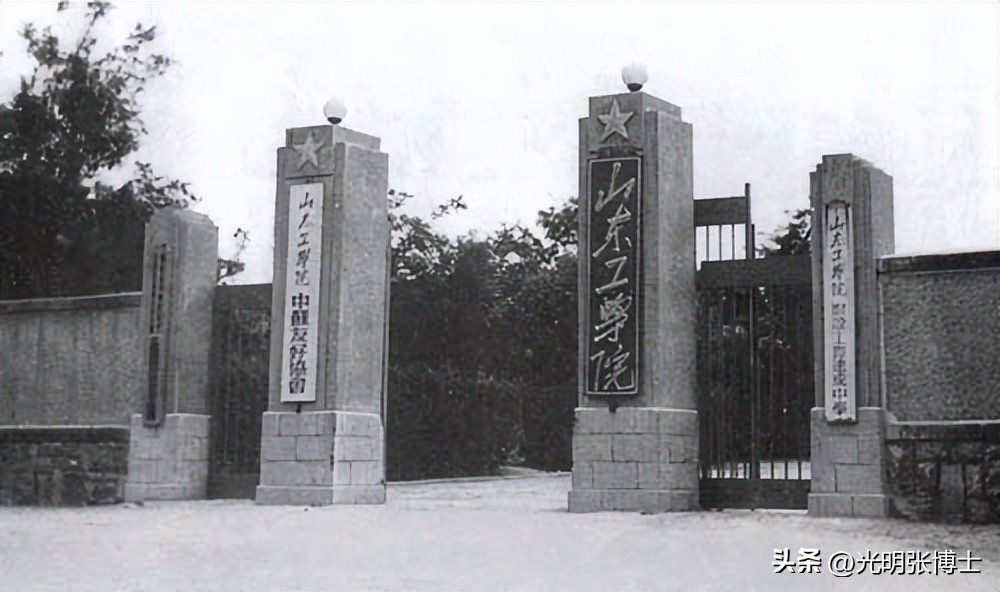 在1949年成立的山东工业专科学校等基础上,1950年在这里建立了山东工学院。其机械、电机两系由山东大学调入。下面是山东工学院的校门,许多在此期间读书或工作的校友会记忆犹新。