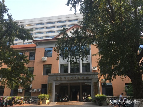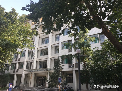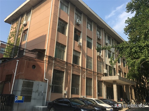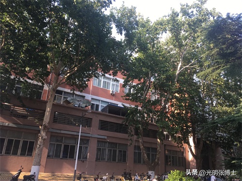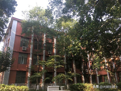 门口东边的红色传统建筑,为加固后绿树掩映下的教学六楼,数十年来外观依然故我。