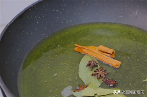 11、油热之后,放入桂皮,香叶,八角,炸出香味。