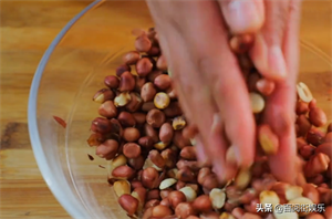 6、花生放凉后,双手揉搓花生,去皮。