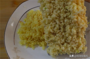 4、洗干净的生姜切成姜末,洗干净的蒜瓣切碎,放入盘中备用,哈哈,如果借助搅拌机工具,那就事半功倍了。