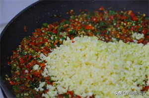 13、辣椒翻炒出来后,就放入事先备好的姜末与蒜末,并翻炒。