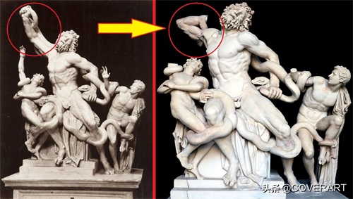 拉奥孔Laocoön是遗失后,于1506年被重新发现。然而,被重新发现的雕像并不完整,有一部分丢失了,其他部位好说,顺势而为就能补救,但是手臂就麻烦了,彻底遗失,可以看下图。