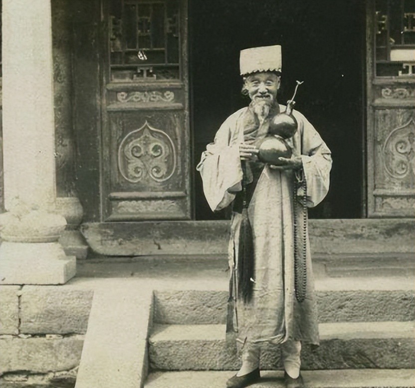 2.手持葫芦的道士,画面中的葫芦已经被把玩包浆,照片虽然是黑白的,但依然能看出葫芦透出的光。