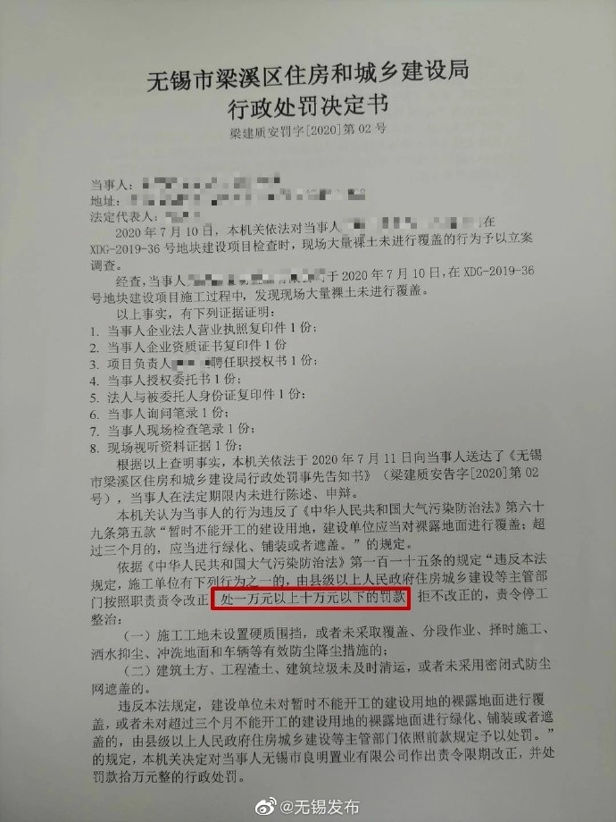 【顶格罚10万,无锡动真格!】多次告知拒不改正!8月14日,在通江大道和庆丰路交叉口旁的庆丰地块上,某置业有限公司负责人拿到了无锡首张对开发商扬尘管控不到位的顶格处罚决定书。该公司负责人任某十分自责,一个多月来,梁溪区住建局执法人员曾多次上门告知要求整改,他嫌盖绿网麻烦,而以往未开工地块少有人管,于是心怀侥幸。这次因小失大,悔不当初。市污染防治攻坚办相关负责人表示,今后工地扬尘治理不到位的,发现一起查处一起,绝不姑息。(无锡日报)