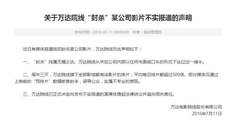 万达院线在声明中称,从未在公司内部以任何书面或口头的形式下达过这一指令,“封杀”纯属无稽之谈。声明中还指出,周末三天万达院线旗下全部影城都有该影片的排片,平均每日排片都超过500场。