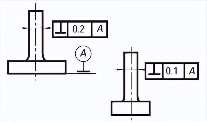 公差带是距离为公差值t 且垂直于基准面的两平行平面之间的区域。