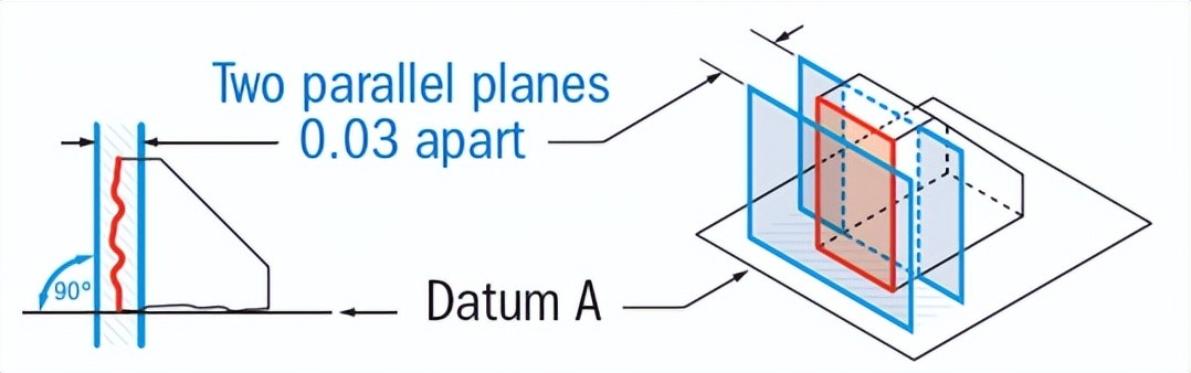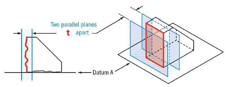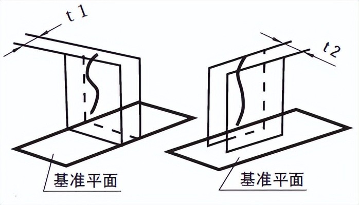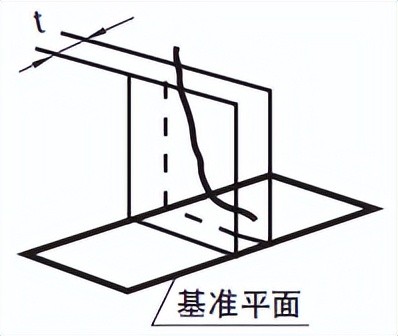 在给定方向上,公差带是距离为公差值t且垂直于基准面的两平行平面之间的区域。