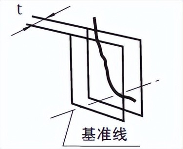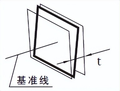 公差带是距离为公差值t且垂直于基准线的两平行平面之间的区域。