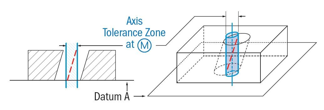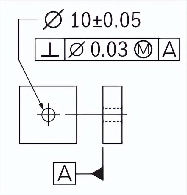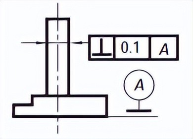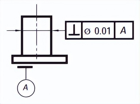 被测轴线必须位于直径为公差值Φ0.01且垂直于基准面A(基准平面)的圆柱面内。