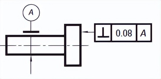 被测面必须位于距离为公差值0.08且垂直于基准线A(基准轴线)的两平行平面之间。