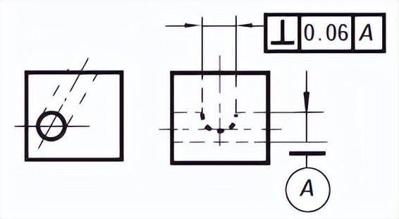 被测轴线必须位于距离为公差值0.06且垂直于基准A (基准轴线)的两平行平面之间。