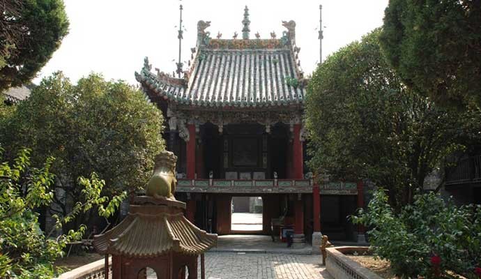 花戏楼大殿分前后殿,前殿券棚是五架结构,雕绘富丽堂皇,是观戏所用;后殿又分前后两部,前部山墙开两便门,西门“便禅门”,“东门”“通神道”。座上铸铭曰:“皇大清道光元年(1821年)岁次辛已秋吉日铸造旗杆一对,重二万四千斤,陕西从药材邦弟子敬献铁杆一对,永保四方平安吉庆有余。”