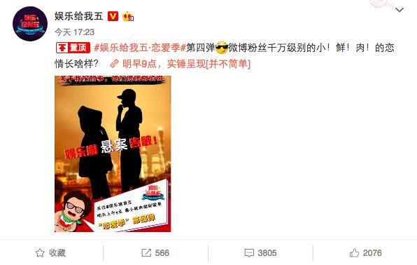 娱乐给我五将于明早十点爆出恋爱季第四弹:微博粉丝千万级别的小鲜肉的恋情!