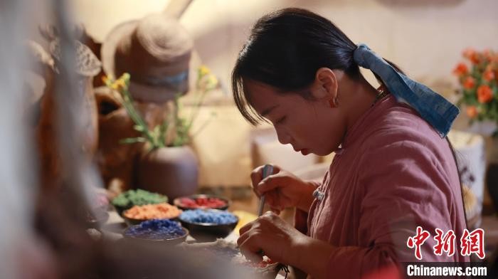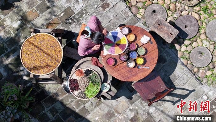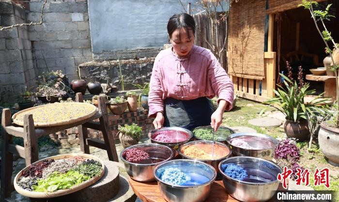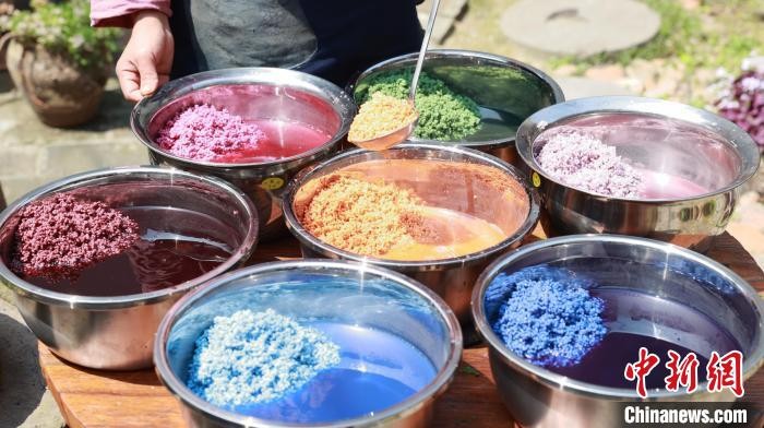 图为梁丝珍用各种颜色的植物染料浸泡糯米。汤晓逵 摄