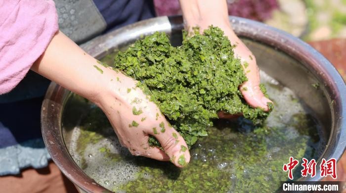 图为梁丝珍清洗切好的枫叶,用于制作黑色染料。汤晓逵 摄