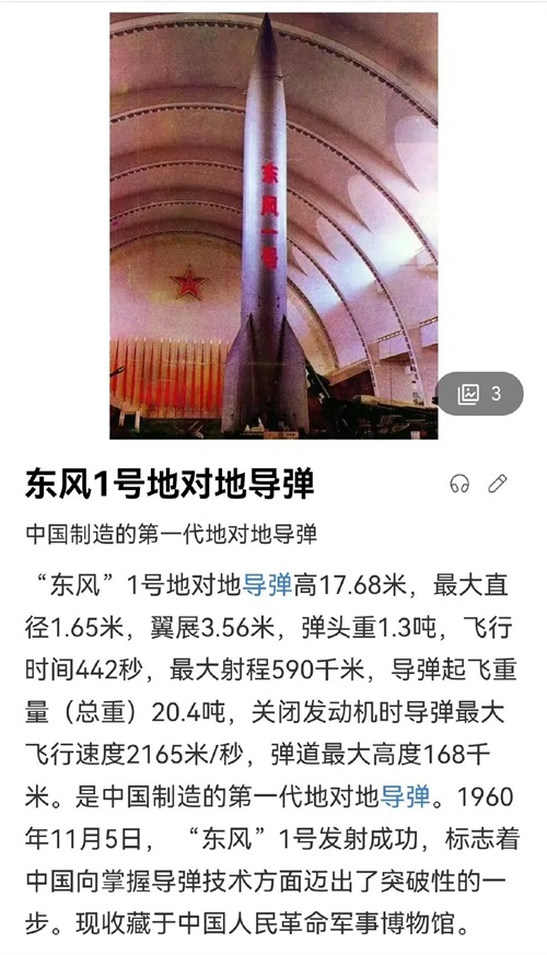 自20世纪50年代末至60年代初期,中国发展了自己的导弹技术,并成功制造了第一枚自行研制的近程地对地导弹——东风一号。