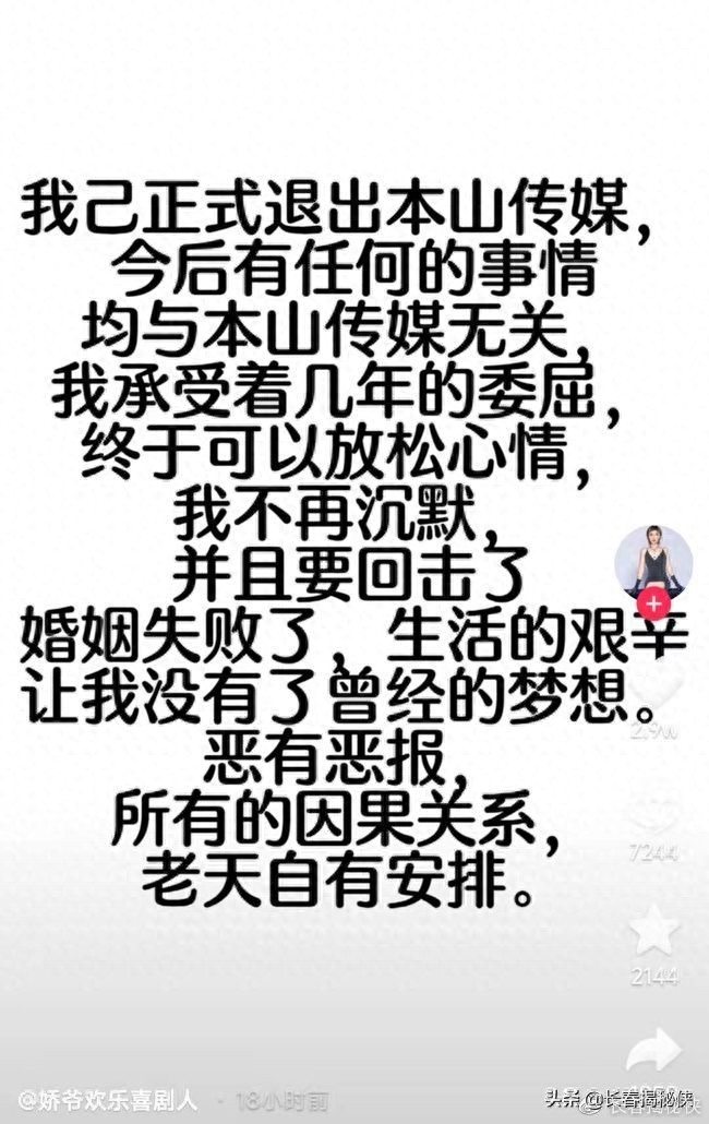 2月8日,原本山传媒艺人、靠《欢乐喜剧人》一炮而红的喜剧人娇娇突然发文炮轰赵本山,称早已看透这个所谓艺术家的为人,从此离开本山传媒,与前公司再无瓜葛!自己这些年承受了太多的委屈,终于可以放松心情,不再沉默,并且自己要“回击”了。