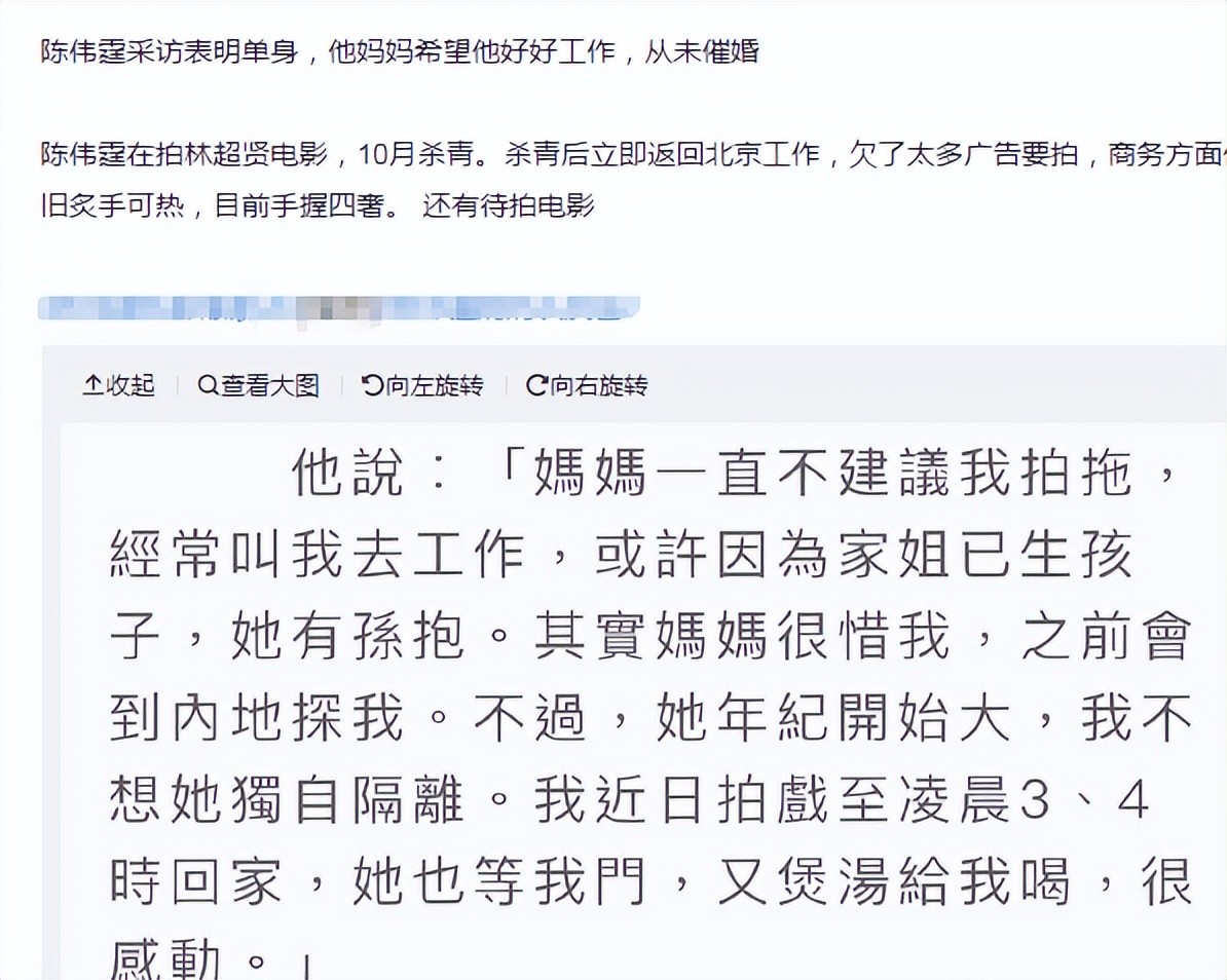 翻看陈伟霆最近动态,在8月份受访时,他的确有表明单身身份,陈伟霆直言:“妈妈一直不建议我拍拖,经常叫我去工作”,还说等电影10月杀青,会立即返回北京工作,大表事业心。