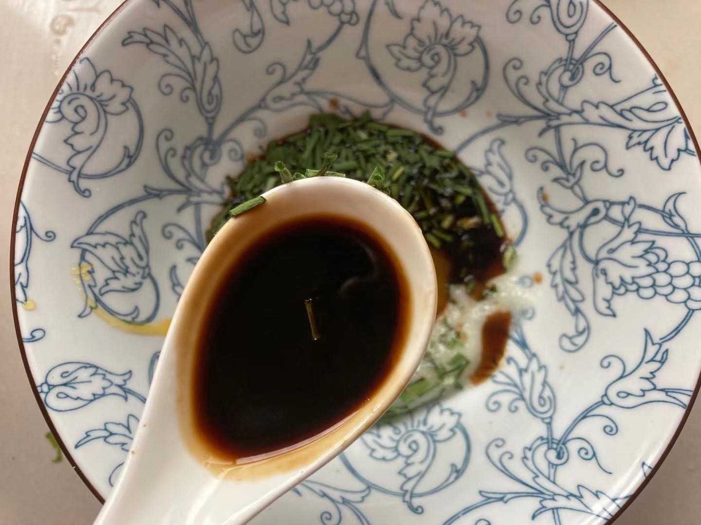 3:小葱洗净用刀切成葱花放入碗中后倒入适量猪油,1匙陈醋,2匙生抽,适量的盐和适量鲜鸡汁没有不加,备用。