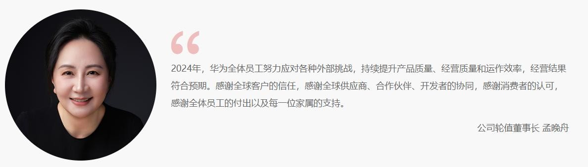 这段时间刚好是孟晚舟做轮值董事长,孟晚舟表示:“2024年,华为全体员工努力应对各种外部挑战,持续提升产品质量、经营质量和运作效率,经营结果符合预期。”并且感谢了员工、合作伙伴、开发者、以及消费者对华为的支持。