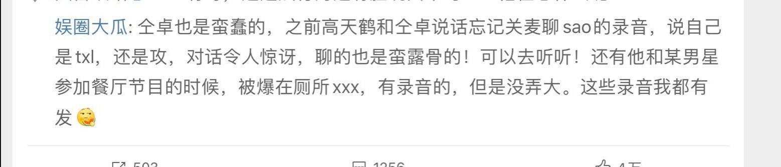 然而发生在仝卓身上的绯闻还远不于此,此前还有内部爆料称他是“txl”,并且还被人曝光了与高天鹤露骨的聊天语音,得知真相后的大众对他越来越失望。明星在进入娱乐圈之前,更重要的是健全自身人格的发展,如果诚实的本性,话里话外都只剩下粗俗,试问这样的偶像谁会青睐?不仅如此,成为公众人物以后一言一行都很容易成为大众的导向,他的一些简单举动就会带来不可想象的影响力。更何况他不仅是声入人心男团Super Vocal成员,还参加过《升入人心》、《向往的生活》、《快乐大本营》等节目,此类等同于自毁前途。